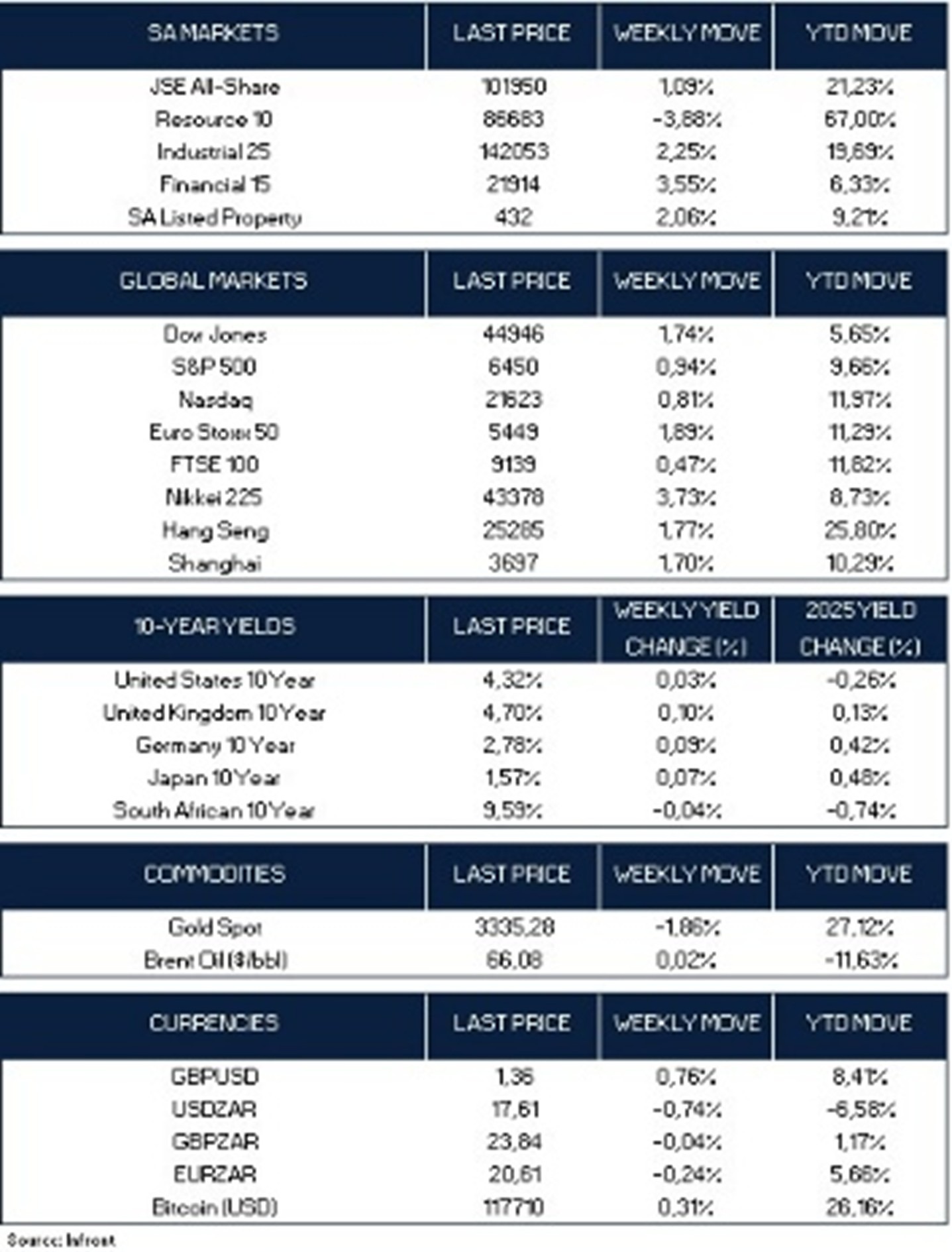 The JSE All Share Index gained 1.09% over the last week, lifting year-to-date returns to 21.23%. Financials led the advance, climbing 3.55%, while industrials gained 2.25% and property added 2.06%. Resources pulled back 3.88% but remain the standout performer this year with a 67% gain. Despite headwinds, local equities continue to deliver strong returns in 2025.