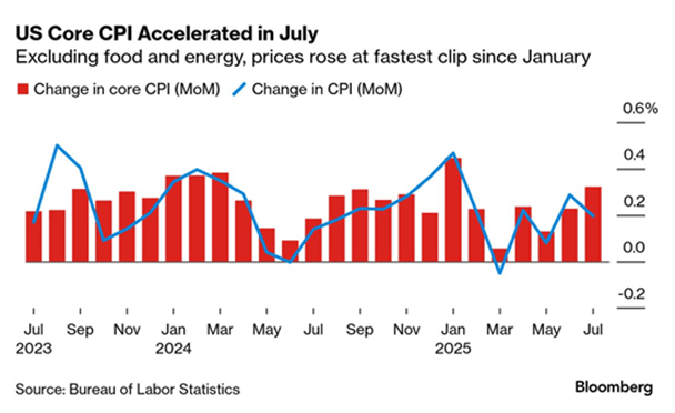 July’s US CPI came in at 2.7%, in line with expectations and helped by lower petrol prices, but core inflation rose to 3.1% – the highest since February -driven by services. Producer prices also recorded their biggest rise in three years, highlighting ongoing cost pressures. Still, the data was less severe than feared and, alongside softer labour-market signals, pushed market odds of a September Fed rate cut above 90%. Source: Bloomberg
