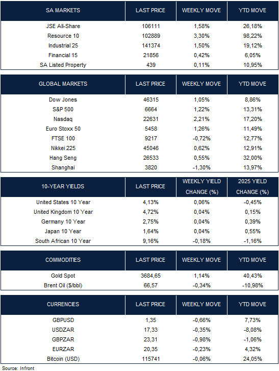 The All-Share Index rose 1.58% last week, boosted by Resources and Industrials. The local currency strengthened against the U.S. dollar, moving to R17.33/$ from the previous week’s R17.39/$ level. The 10-year SA government bond extended its year-to-date rally, with yields falling 18 basis points over the week.