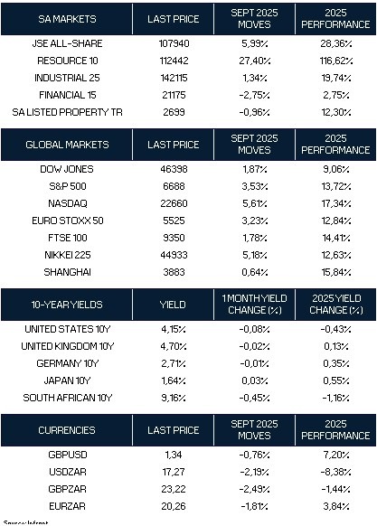Global markets ended the third quarter on a constructive note, with September extending the gains seen across most major indices this year. Investor sentiment was supported by moderating inflation, resilient economic activity, and growing conviction that the next stage of the cycle will be defined by gradual monetary easing. The MSCI All-Country World Index advanced 3.6% in September and is now up 7.6% for Q3, with developed and emerging markets both positive. In the U.S., softer labour data and dovish commentary reinforced expectations of a Fed cut before yearend. In Europe, political and fiscal uncertainty capped enthusiasm, but equities still managed to advance. Japan and U.S. technology shares outperformed strongly, supported by gains in Chinese tech, while the broader mainland Chinese market lagged as property and consumption headwinds persisted despite renewed stimulus efforts. Commodities diverged, with gold surging to new record highs on safe-haven flows while oil stabilised after prior weakness. South Africa posted another standout month, with the JSE All Share gaining nearly 6% – its seventh consecutive advance – driven overwhelmingly by resources. The rand strengthened alongside firm commodity inflows.