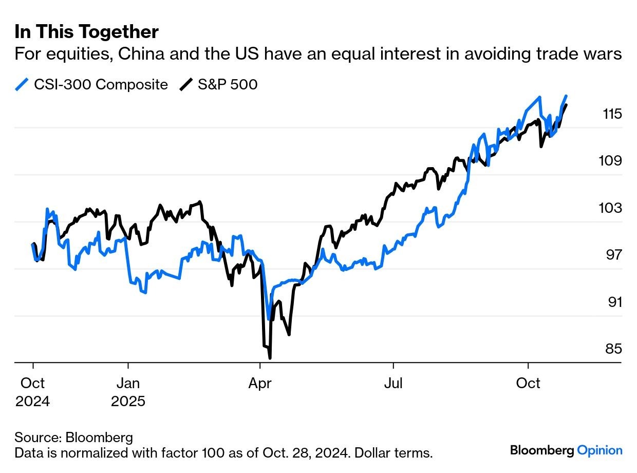 Global equities started the week on a strong note, with the S&P 500 and Nikkei 225 reaching record highs—the latter topping 50,000 for the first time. Gains were broad-based across major indices, fuelled by optimism after reports of progress in U.S.–China trade talks in Kuala Lumpur. The prospect of easing trade tensions drove renewed risk appetite and pulled investors away from defensive assets such as gold, which has slipped below $4,000/oz. The chart illustrates how closely U.S. and Chinese equities have moved in tandem this year, underscoring the deep link between global sentiment and the stability of their trade relationship. Source: Bloomberg