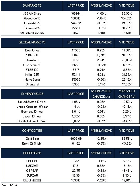 He also emphasised alignment between fiscal and monetary authorities, noting close coordination with Treasury ahead of the Medium-Term Budget Policy Statement on 12 November, where a formal adoption of the new target could be confirmed. Meanwhile, National Treasury reported a R15.36 billion budget deficit for September, suggesting the current account shortfall widened modestly from 1.1% of GDP in Q2 to 1.6% in Q3, while producer inflation eased to 2.3% year-on-year, indicating softer upstream price pressures. Locally, the JSE All Share Index fell 1.09%, dragged lower by resources (-1.64%), industrials (-0.67%), and financials (-1.61%), while listed property advanced 1.30% to cap a resilient performance for the sector. The rand weakened slightly by 0.38% to R17.31/$, while the 10-year government bond yield eased marginally to 8.87%.