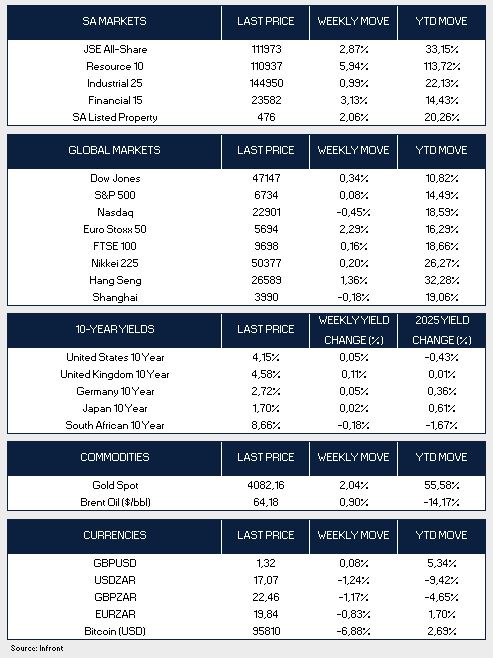 The positive sentiment was reflected on the Johannesburg Stock Exchange, where the All Share Index rose 2.87% for last week, supported by gains in resource and financial stocks. The rand strengthened to R17.07/$ at Friday’s close, marking its strongest level against the dollar in nearly three years.
