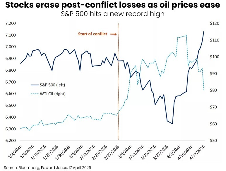 What a difference a few weeks can make. Following a sharp sell-off driven by geopolitical tensions and rising oil prices, global equities have rebounded strongly, with the S&P 500 and Nasdaq 100 back at record highs. As oil prices ease and fears of further escalation subside, sentiment has improved, allowing markets to refocus on resilient corporate earnings and supporting the recovery in risk assets. Source: Bloomberg, Edward Jones.