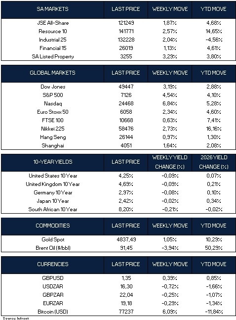 South African markets ended the last week firmer, with the JSE All Share Index gaining 1.87%. Resources led the advance (+2.57%), while industrials (+2.04%) and financials (+1.13%) also contributed positively. Listed property was a standout performer, rising 3.29% on the last week. The rand strengthened modestly to around R16.30 against the U.S. dollar, while the South African 10-year government bond yield declined by 21 basis points to 8.20%, reflecting improved sentiment toward local fixed income.